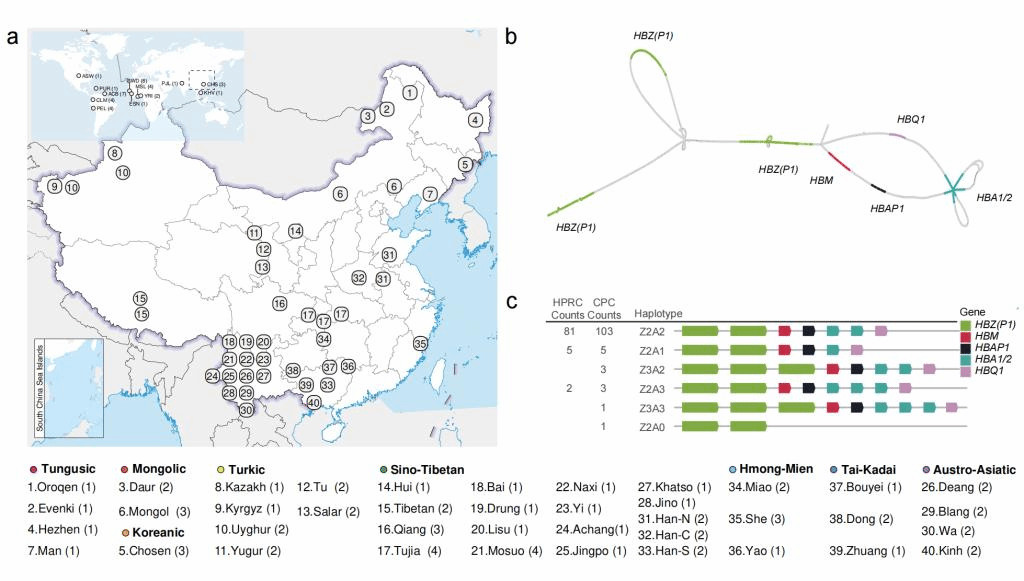 图1. 中国人群泛基因组样本及其所揭示的α-珠蛋白基因簇多样性