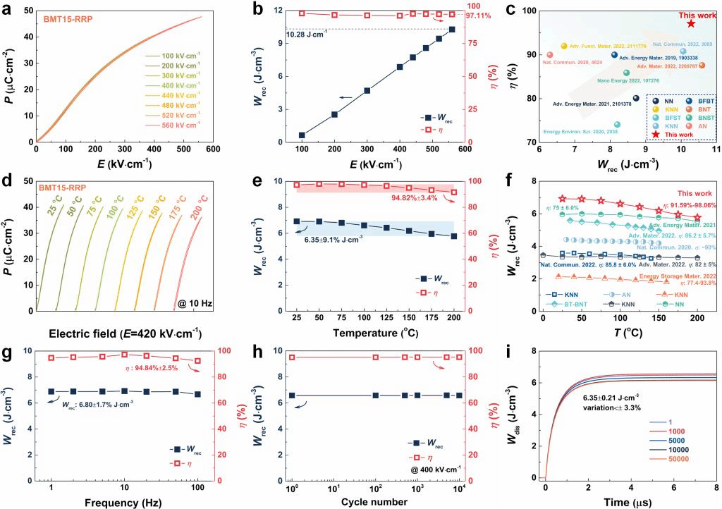 BMT15-RRP陶瓷在不同测试条件下(电场、温度、频率和循环次数)的储能特性