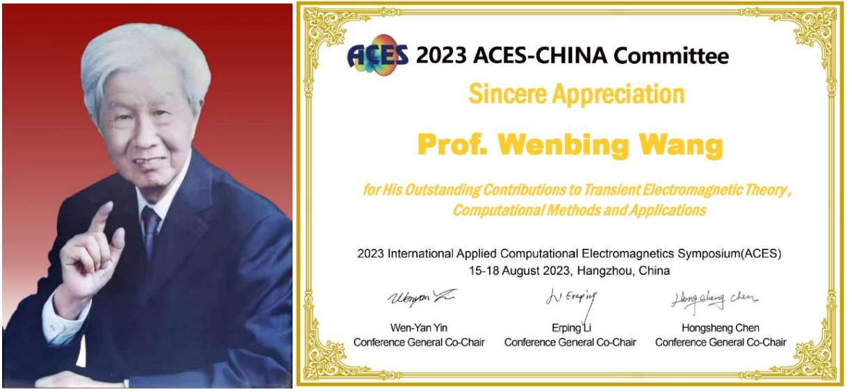 国际应用计算电磁大会(InternationalAppliedComputationalElectromagneticsSymposium,简称ACES)是电磁学领域的著名国际会议。在ACES 2023大会上,为感谢完美体育平台官网汪文秉教授在瞬态电磁场理论、计算和应用方面做出的杰出贡献,大会授予汪文秉教授杰出成就奖。