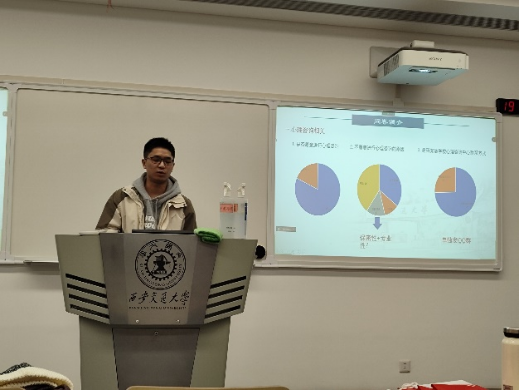 随后,针对本班同学们心理健康的问卷调查结果,唐全能进行了汇总与分析。他指出:问卷活动旨在了解同学们对心理咨询的认识和对心理问题的来源及如何解决问题的思考。为了更好地加强班级成员的心理健康建设,唐全能也收集并展示了同学们有关如何加强班级心理健康的建议,其中,包括不少切实可行的措施,如:定期谈话了解同学们的心理状况,积极组织开展班级集体活动等。同时,问卷调查也展露了一些问题,如部分同学不知道学校心理咨询室的联系方式等,为后续的心理健康建设提供了一些的信息和方向。