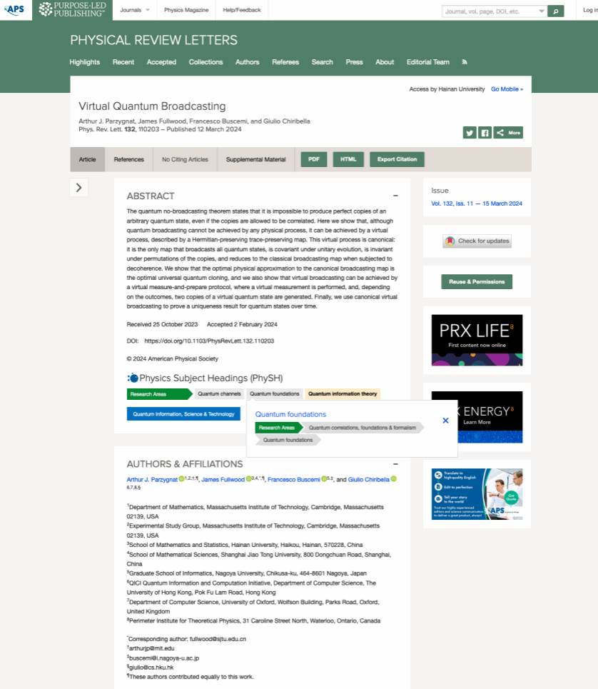 近日,今年会官方网站教师James Fullwood以通讯作者及共同第一作者在权威期刊《PHYSICAL REVIEW LETTERS》合作发表了题为“Virtual Quantum Broadcasting”的学术论文。合作者为麻省理工学院Arthur J. Parzygnat教授、名古屋大学Francesco Buscemi教授和香港大学Giulio Chiribella教授。