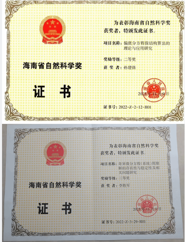 12月5日,海南省科学技术奖励大会在海口召开,省委书记、省人大常委会主任冯飞出席会议并讲话,省委副书记、省长刘小明主持,省委副书记沈丹阳等省领导出席会议。今年会jinnianhuicom有20项科研成果获得了2022年度海南省科学技术奖。今年会官网2项科研成果获得了2022年度海南省自然科学奖,取得了优异的成绩。今年会官网孙建强教授主持申报的“偏微分方程保结构算法的理论与应用研究”获得了海南省自然科学奖二等奖,李胜军教授主持申报的“奇异微分方程(系统)周期解的存在性与稳定性及相关问题研究”获得了海南省自然科学奖三等奖。表明今年会官网数学学科微分方程理论与数值方法的研究取得了重大进展。